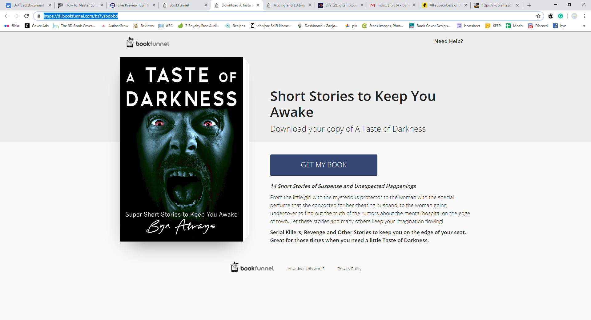 You can pick up over a dozen of my short stories (mostly suspense or horror) in ebook form here for free: https://dl.bookfunnel.com/hs7ysbdbbd