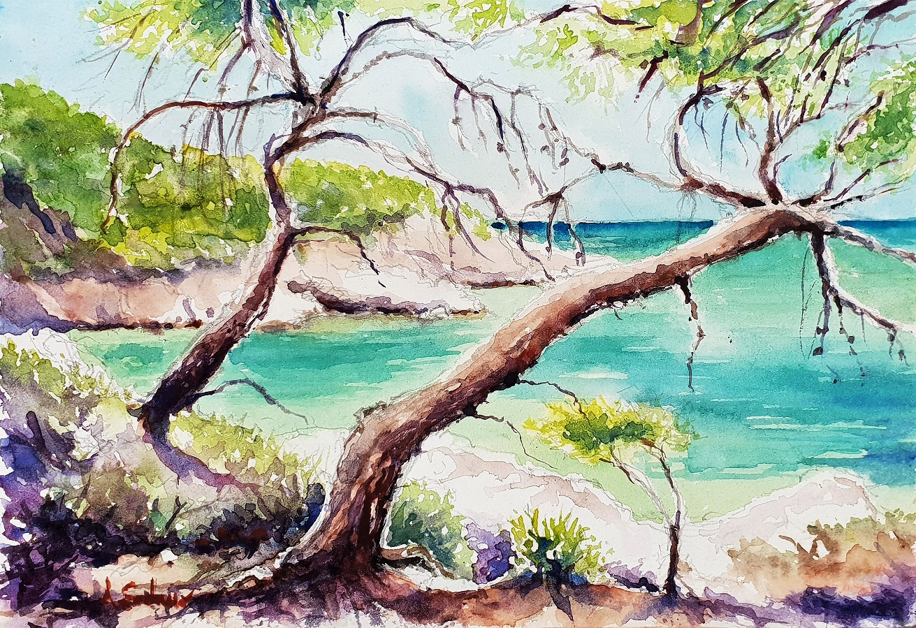 Sunny Day on San Domino – Here we can see the artistry of plein air creation of a watercolour painting! The artwork in this post was made on site as Armando enjoyed a summer day at San Domino, in Tremiti Islands, part of the Ionian Sea. The step by step process is shown with the post, so you may understand the stages of how the painting was created :) Beautiful and delicate colours captured the perfect summer day at this gorgeous Italian island!