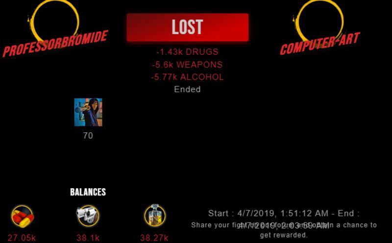 Check my latest fight ! professorbromide vs computer-artcomputer-art (49)in #undefined • 7 years ago #drugwars-fight #gaming #fight #dw