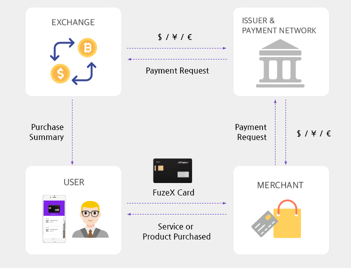 choose your desired currency in fuzex ecard and check your account balance in currency exchange rate for fiat currencies. then hand over fuzex card to the merchant. then request will be sent to issue. issuer check your funds and if there is sufficient funds issue will authorize the payment. then merchant receives the payment authorization and payment is completed. you can check the summary in fuzex wallet.