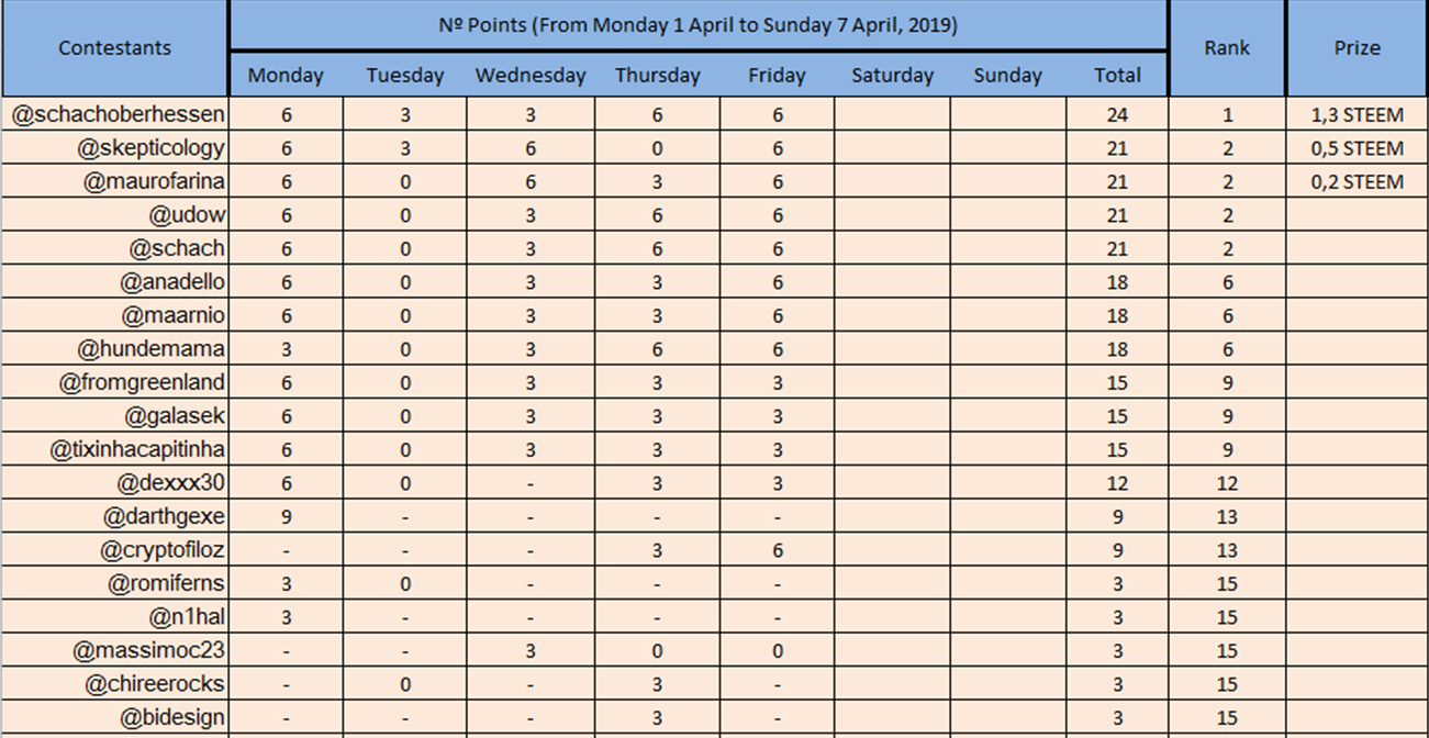 This week we have a Prize Pool of 2 STEEM, which will be split among the Top 3 of the week, according to the following distribution: