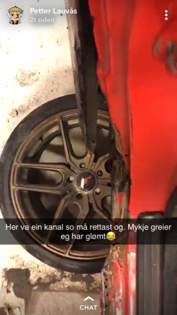 Petter Lauvås driv fortsatt å spøtar på bilen. Eller, det som er att av den. //