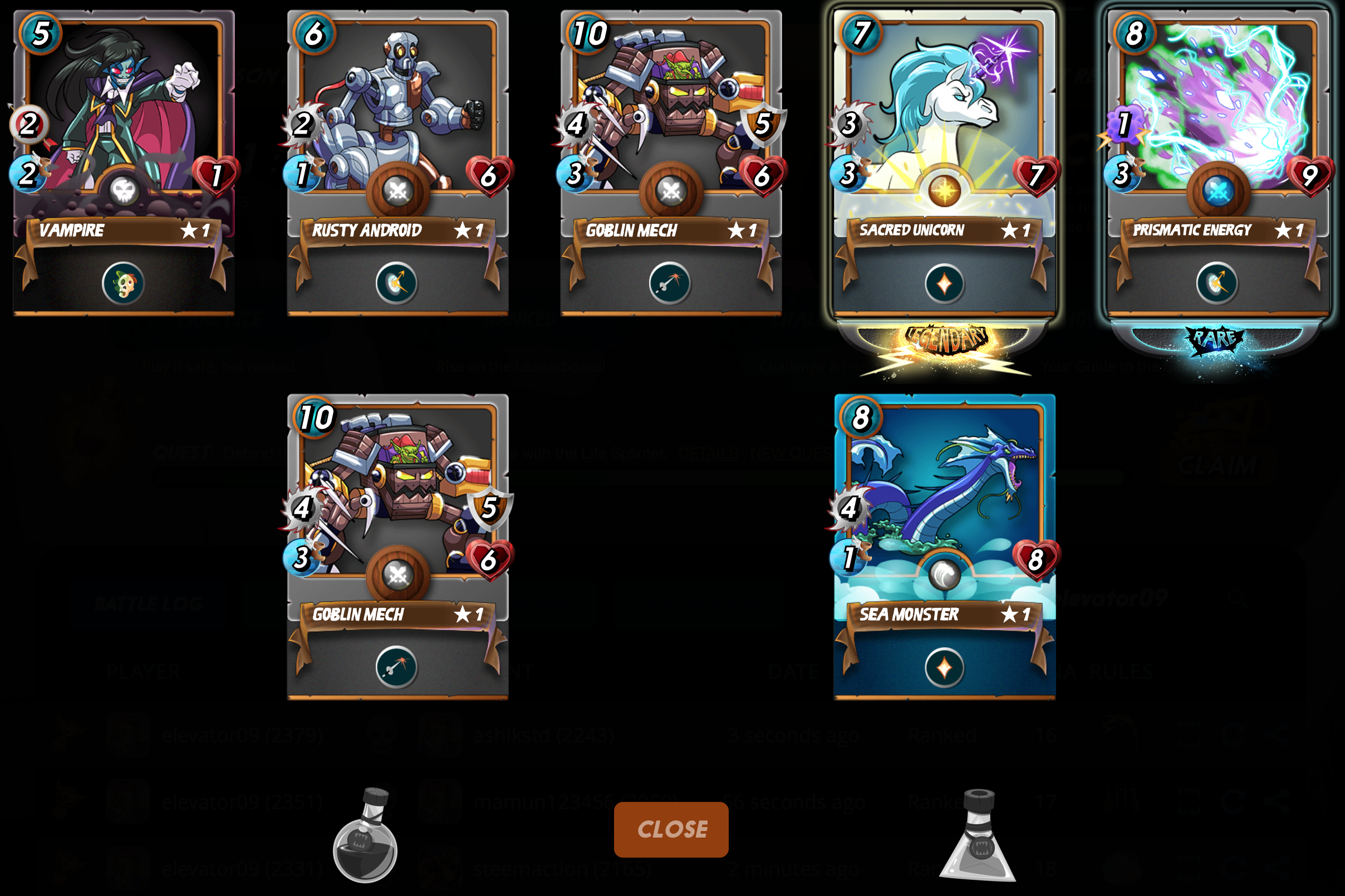 This afternoon I have again played a few rounds in Splinterlands and also completed my daily quest. Because I am currently in the Gold II league, I received seven new cards as a reward for this quest. The cards are definitely good and I even got a rare as well as a legendary one! Currently, the won cards have a total value of $ 2.28. In addition, I bought a mystery potion for the first time in the shop with my saved DEC, and I'm looking forward to a mystery bonus soon.