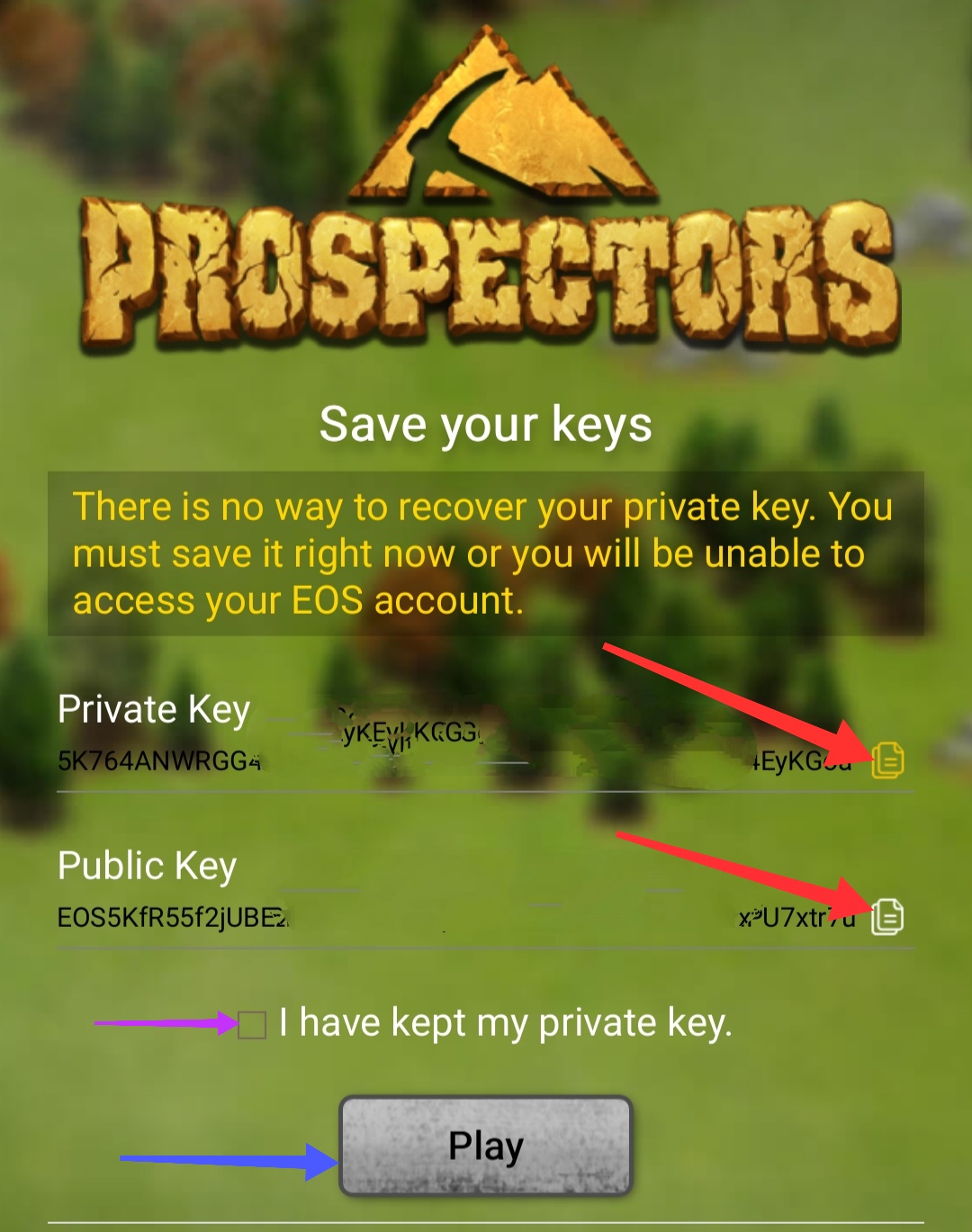 you will be redirected to a new page showing Private key and Public Key. Copy and paste the keys in a safe place. After copying your private Key, Tick on the box I have kept my private key then click on Play