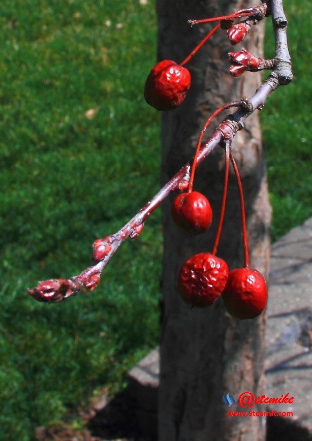 There are still ripe little crabapples on the Indian Magic Flowering Crabapple tree. You can just begin to see the buds coming out.