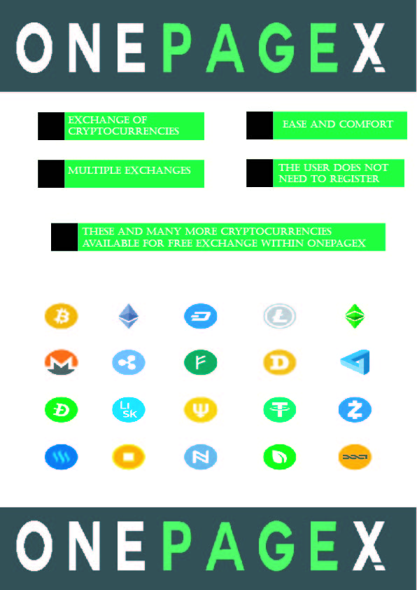 OnePageX's purpose is to exchange cryptocurrencies in a simpler and easier way, with simple selections from different cryptocurrencies. The goal of OnePageX is to increase the conversion and exchange of currencies, and in this way generate growth in this world of crypto