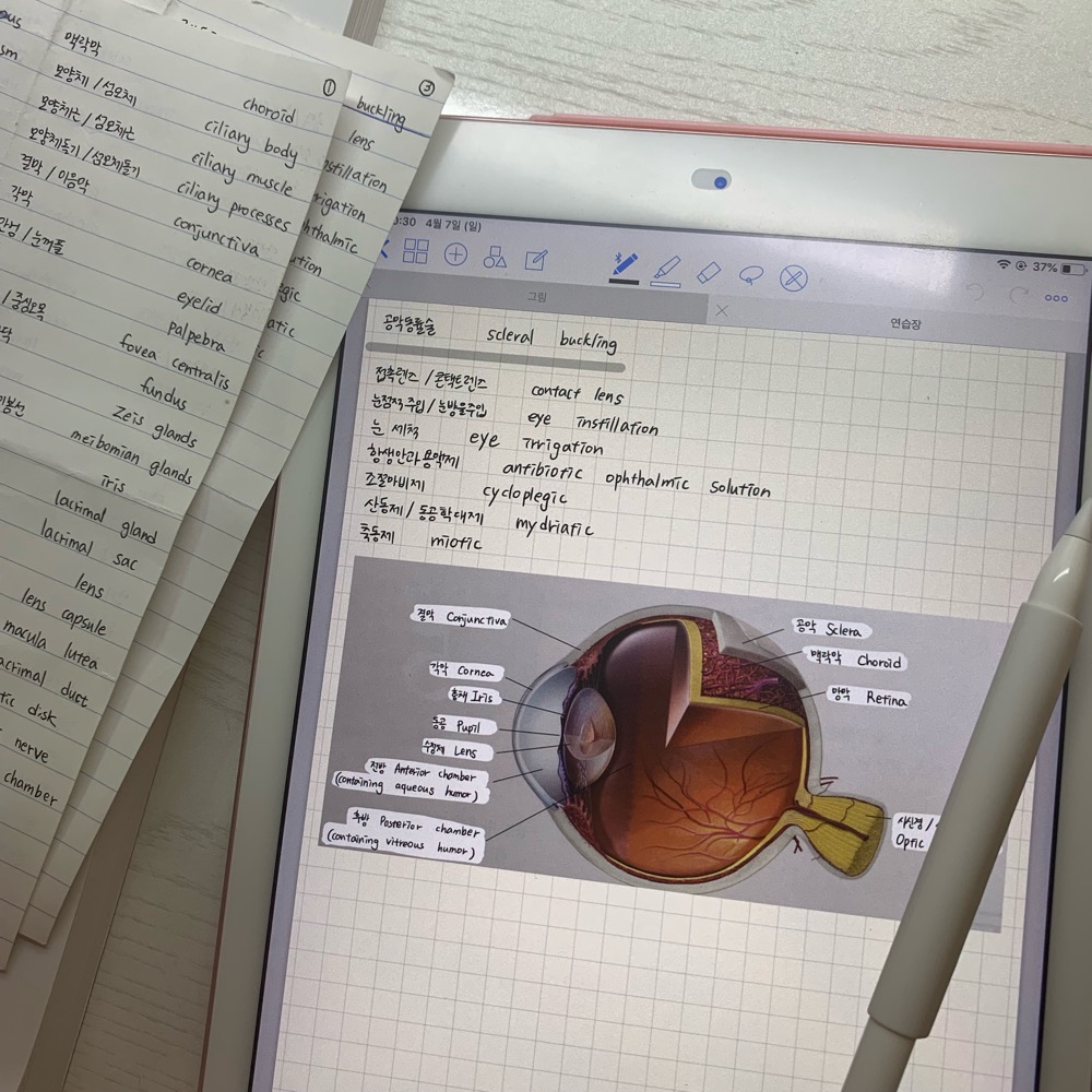 맨날 유튜브 볼때만 사용하던 아이패드가 이젠 공부하는데에도 많은 도움이 되고있다. 전에는 어느 위치인지도 정확히 찾아보지않고 단어만 구구절절 외웠는데, 그렇게 외우면 아무 의미없다는 @cyberrn 교수님의 말씀을 듣고 눈 구조의 전체적인 설명, 특징 그리고 기능 다 꼼꼼히 읽는 중 !