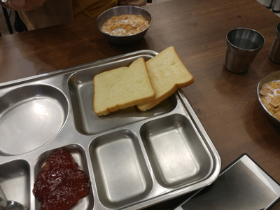bread, cereal, milk, coffee etc, well it's little bit hard to call it 'breakfast buffet' but, it's enough to fill your empty stomach.