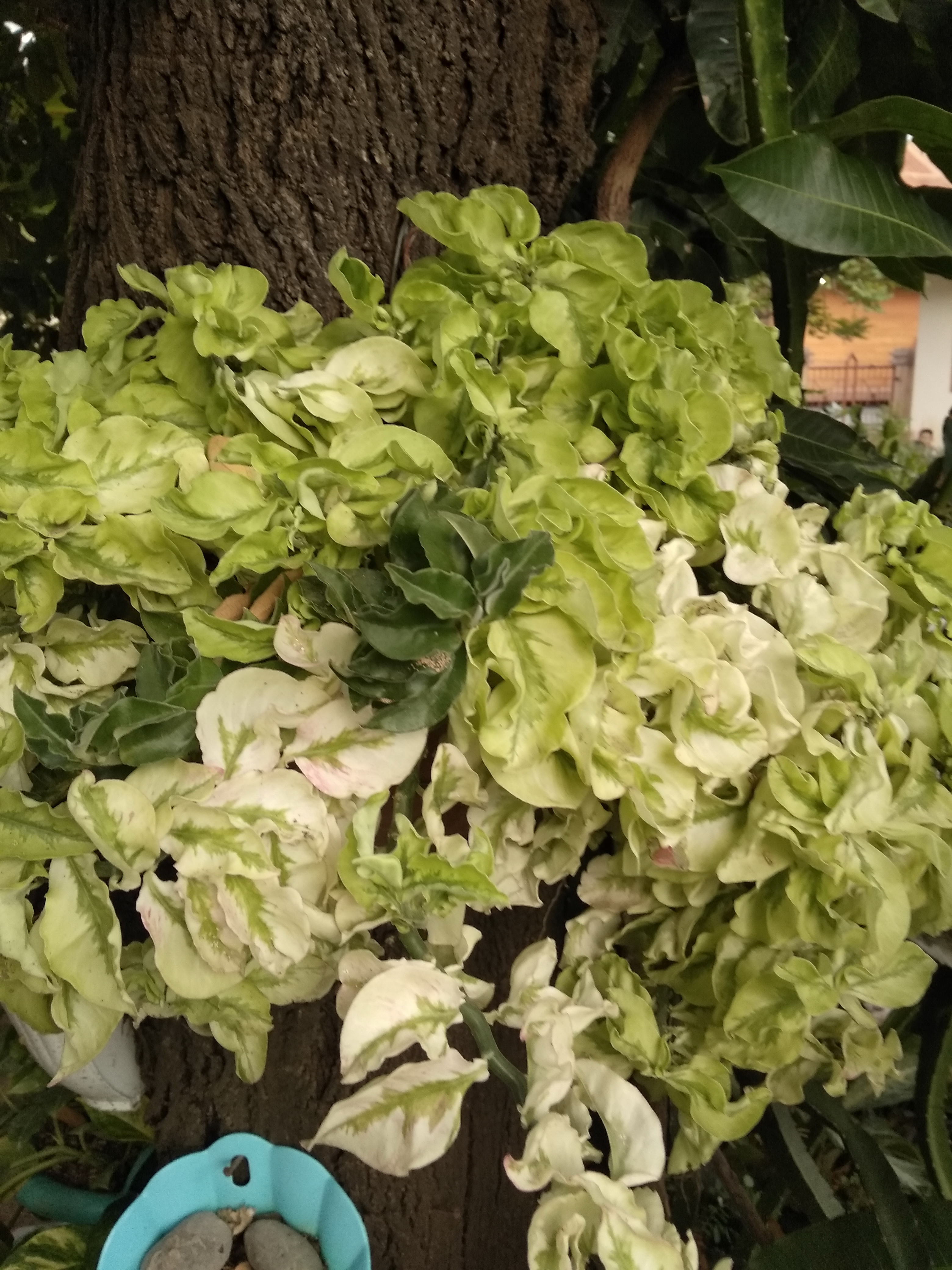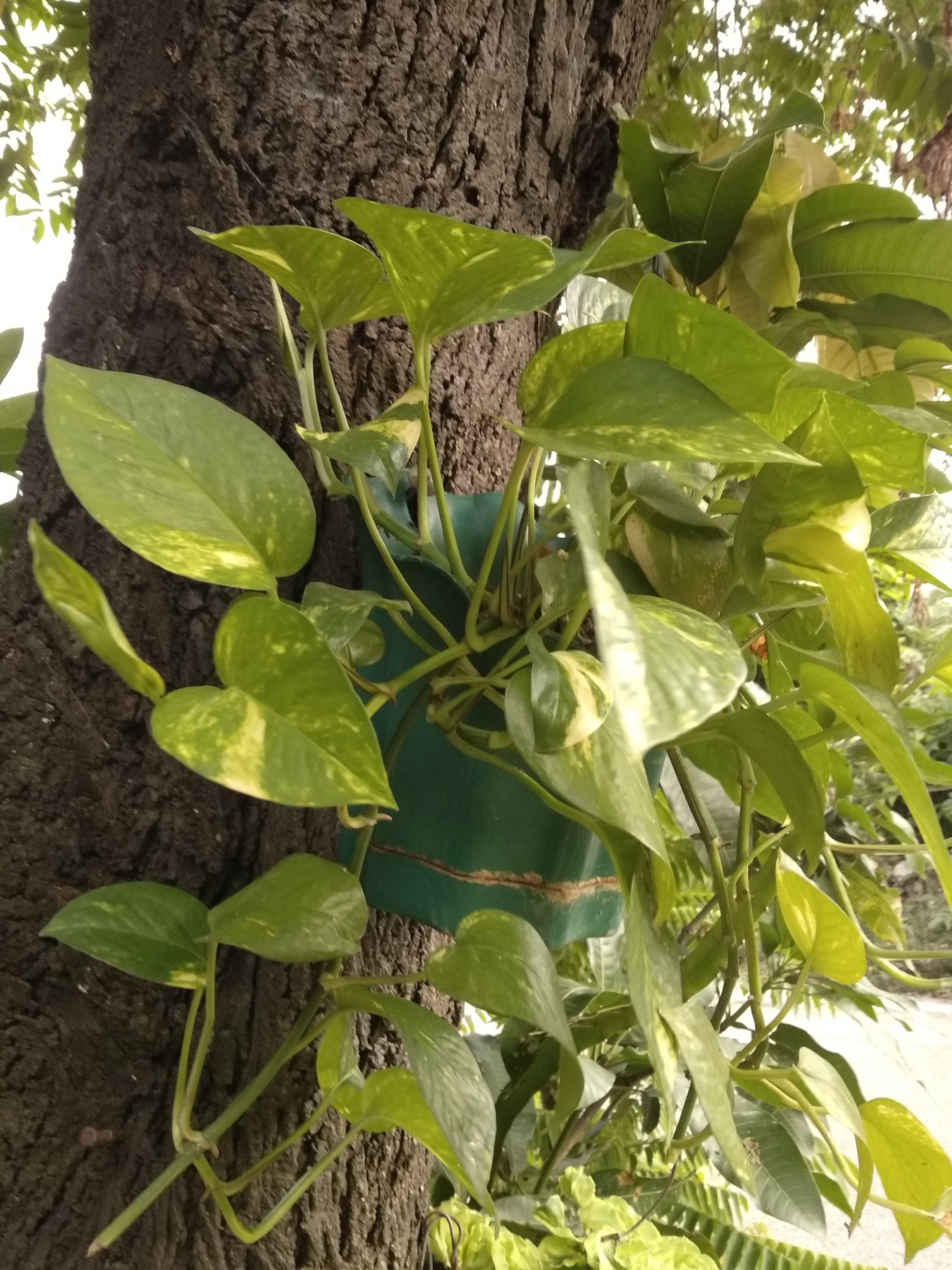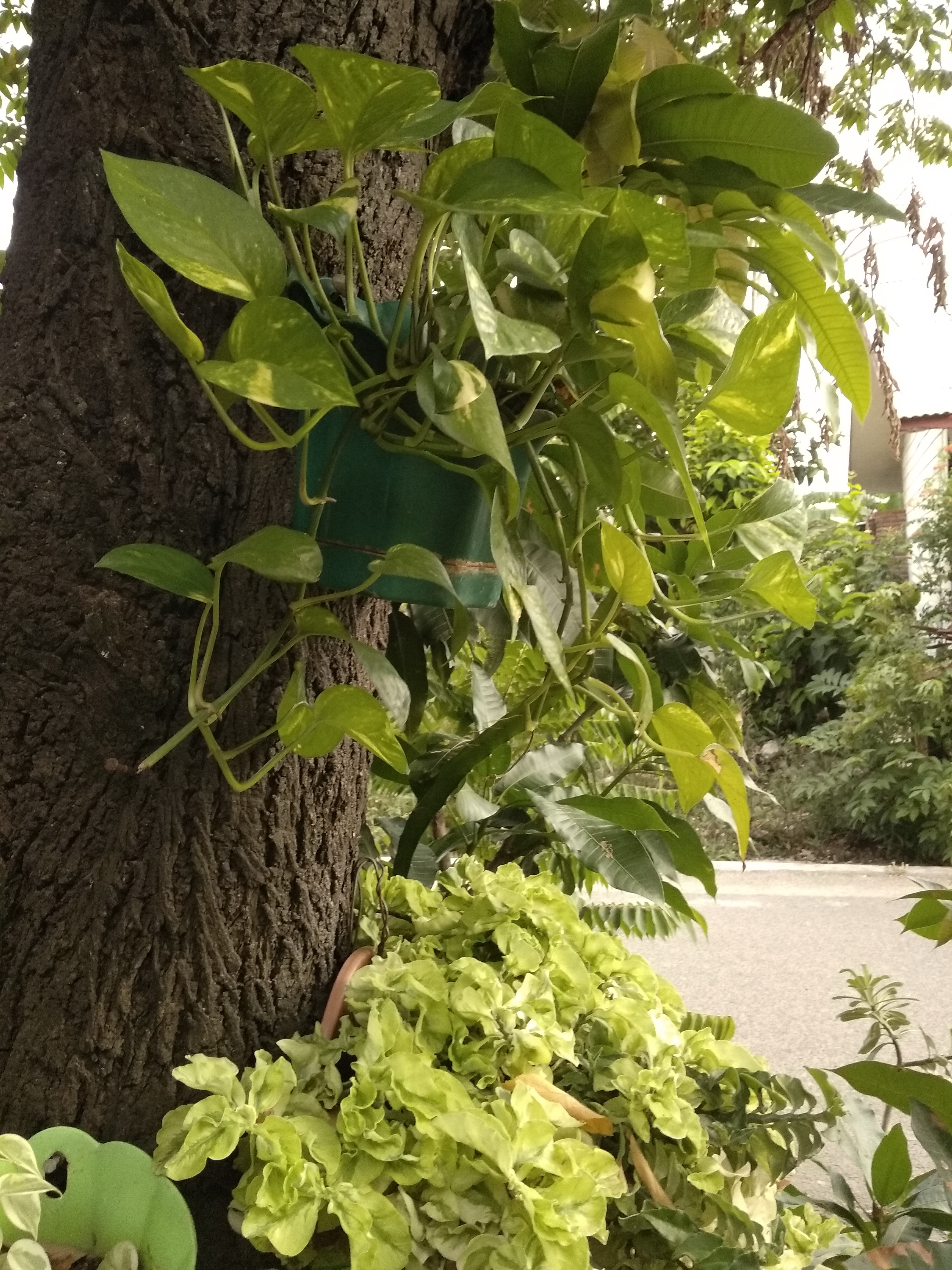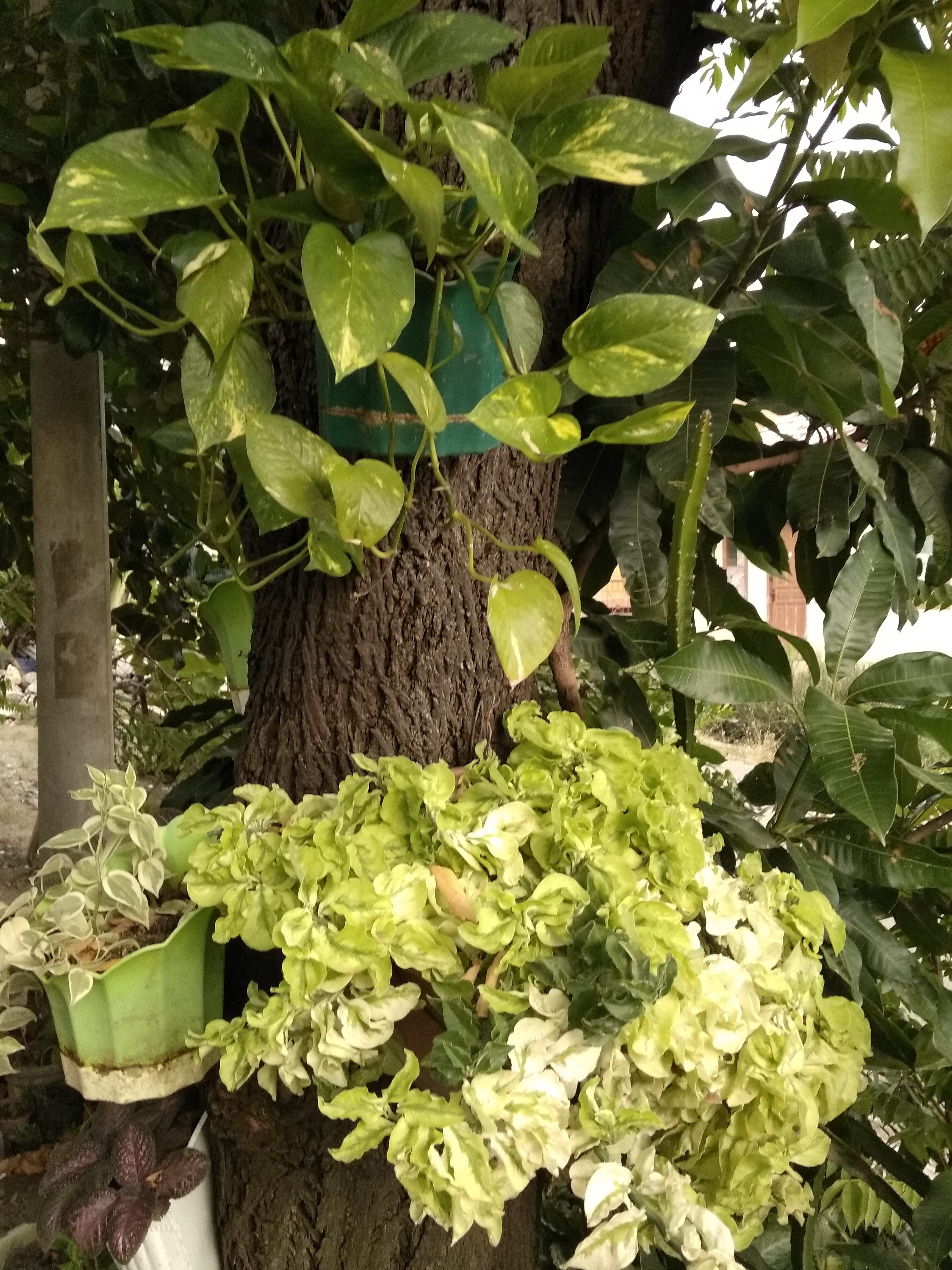 My friend has a tree that is quite shady and right in front of his house. Which makes me interested in seeing the tree trunk in front of my friend's house, there are green plants displayed on the trunk of the tree. My friend used the tree in front of his house by putting the green plants.