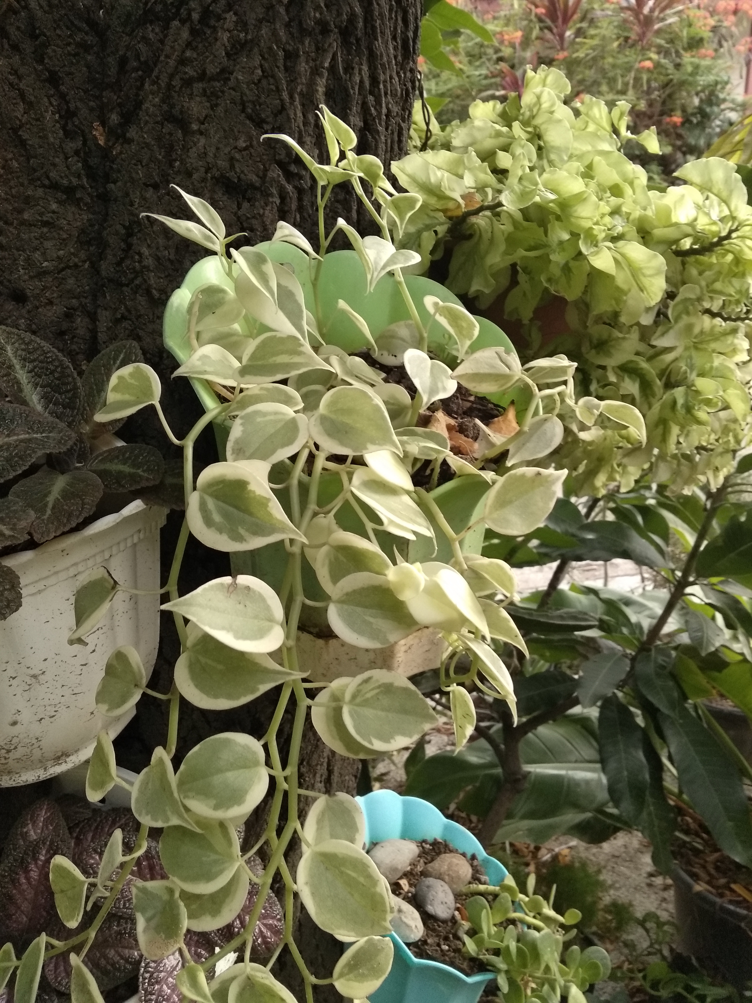 From a distance, the leaves of the green plants are like blending with a tree trunk, but not so friend. My friend planted the green plants in a pot and displayed the green plants on a tree trunk. I really like seeing the creativity of my friend.