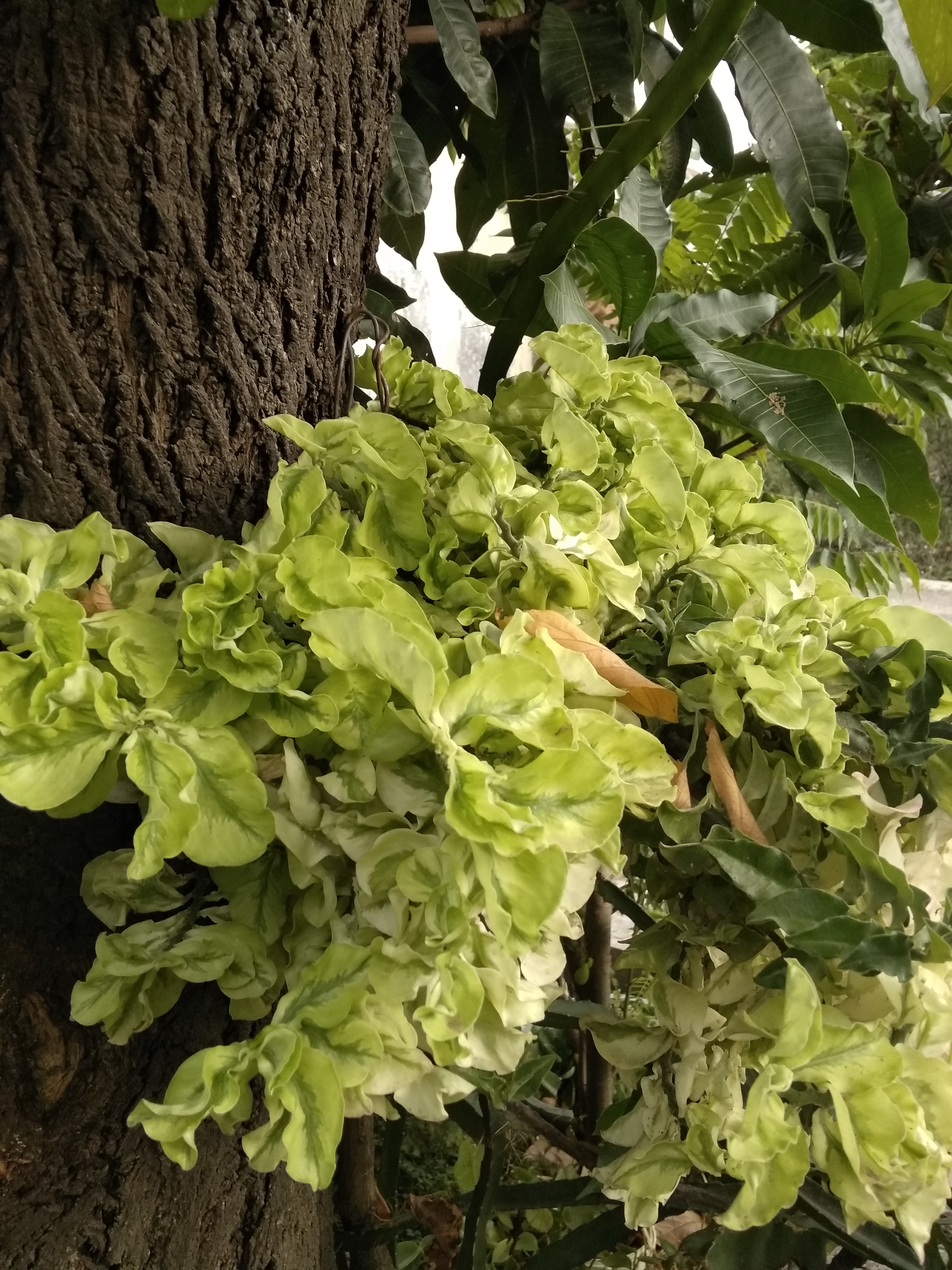 Green plants that are fused on a tree trunk