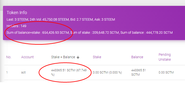 일단 원래는 @sct.jcob님의 Scot Manager에서 위의 빨강 sum과 sct 계정 물량을 차례로 입력하면(빼면 되므로) SCTM 총판매량이 바로 나왔습니다.