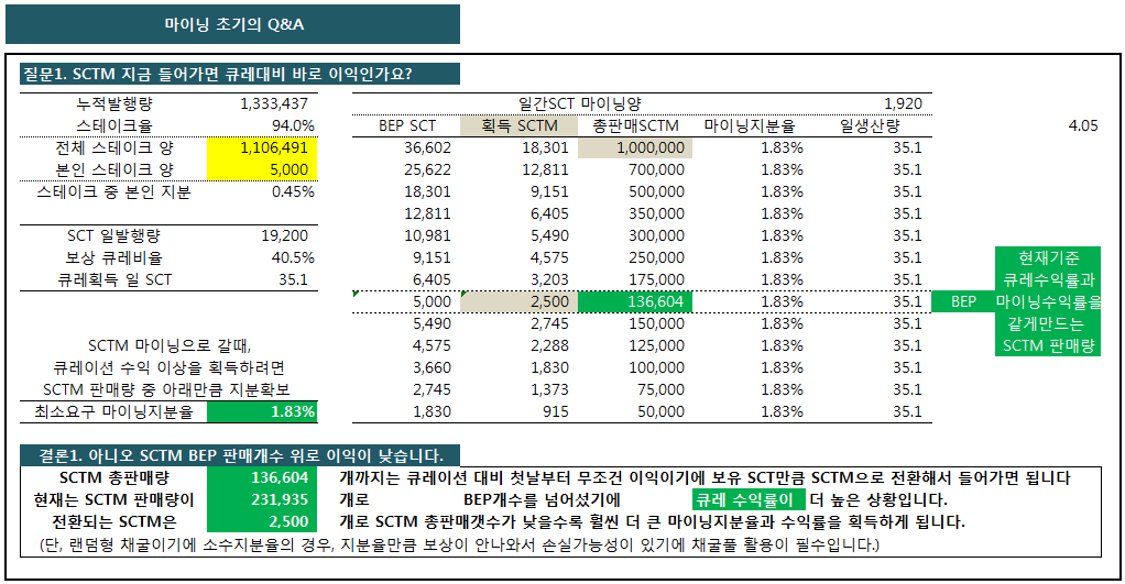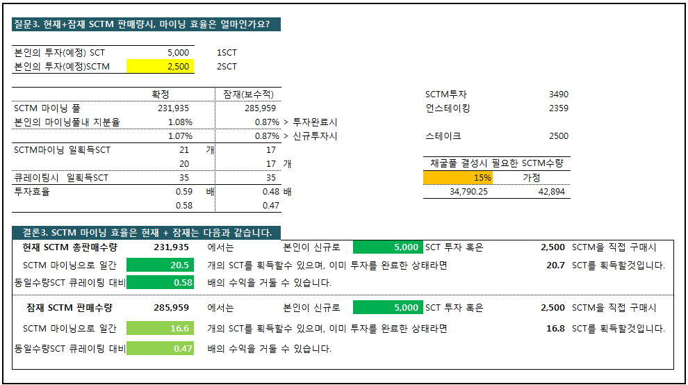 다만, 한가지 함정은 SCTM을 현재지분율로 사놓고 가만히 있으면 안된다는 것입니다. 완판전에 마이닝풀내 다른 참여자들이 SCTM의 구매를 추가한다면, 본인의 지분율은 더욱 떨어지고 획득 SCT도 낮아집니다.