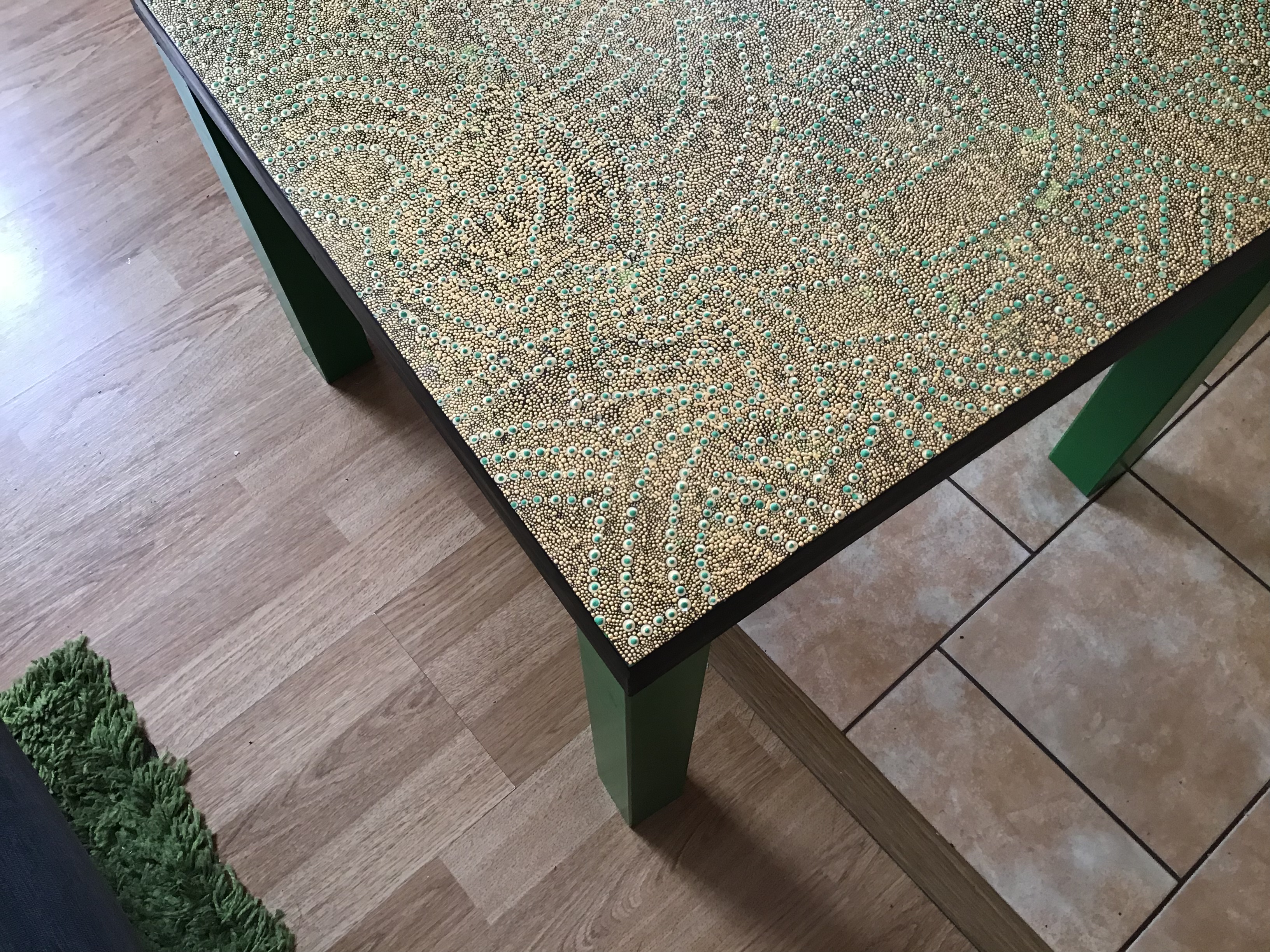 Předevčírem jsem dodělala konečně podtác a stůl byl hotový už před týdnem. Obojí trvalo dva týdny asi bajočko. Jsou to věci koupené v Ikei. Tam nikdy nezklamou, pokud si chce člověk potunit masovou výrobu a udělat si to doma veselejší. Zjistila jsem, že tohle je super relax, oproti mému “serióznímu”projektu, který jsem začla vytvářet asi tak před měsícem a půl. U tohohle člověk vypne a jen sleduje, jak si s ním ty barvy a tvary hrajou a jeho vůle je jaksi potlačena a na povrch se protlačí něco čemu já říkám zdroj. Ten zdroj vybral barvy i tvary a já mu tímto děkuji.