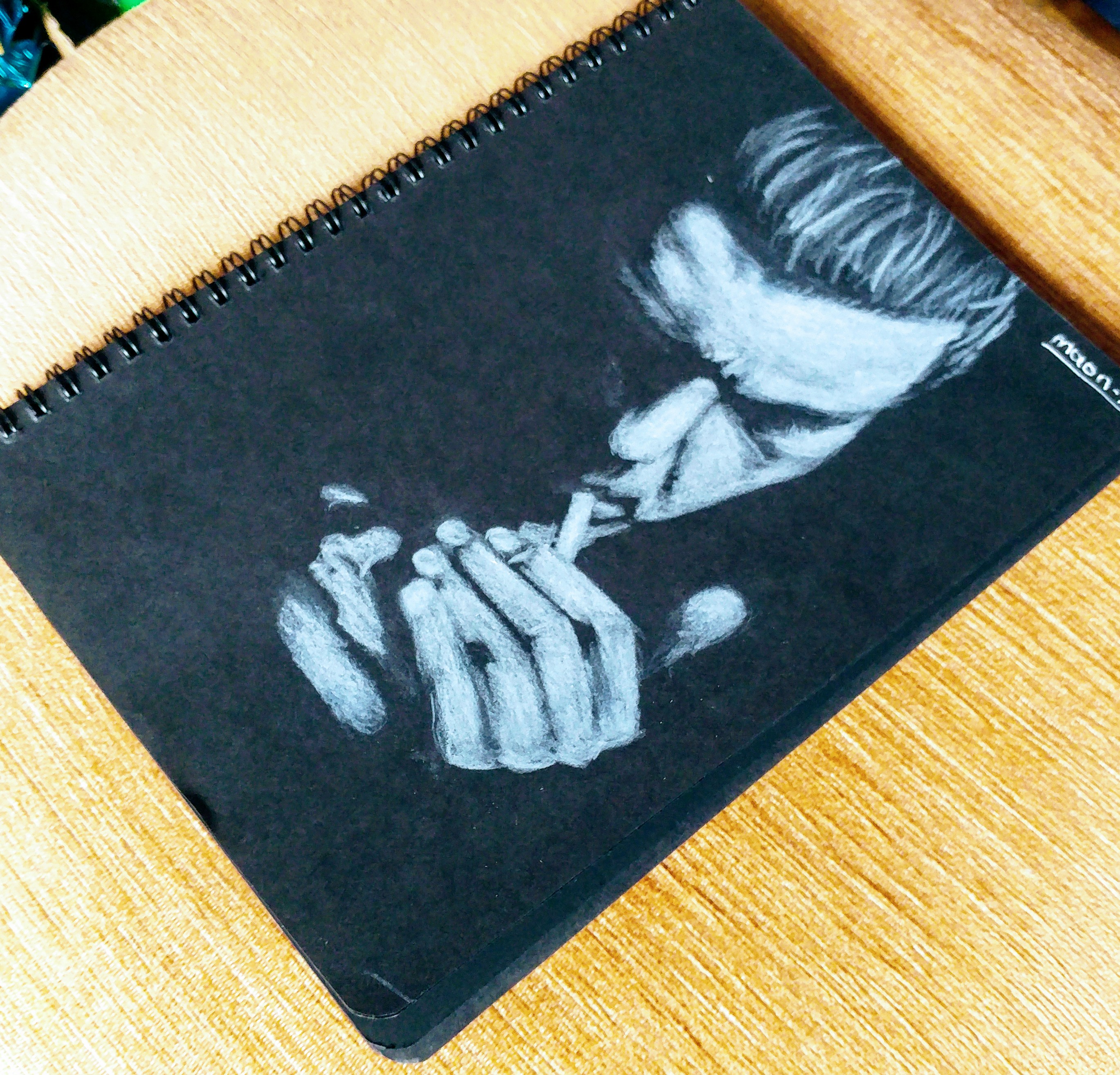 I'm with you more with a drawing. Picture of a man burning his cigarette. This is a picture I made using a different method. Before that, I did the black floor with a pencil, but I didn't get a satisfactory result. Now, I bought a black notebook, I tried to do our picture using a white pen on black paper. From time to time using this method I'm thinking about sharing the drawings here with you. I hope you will like it.