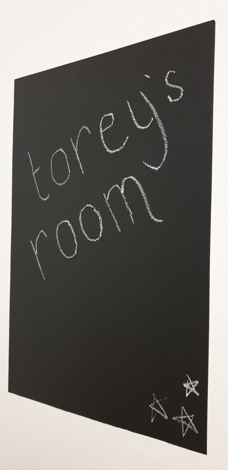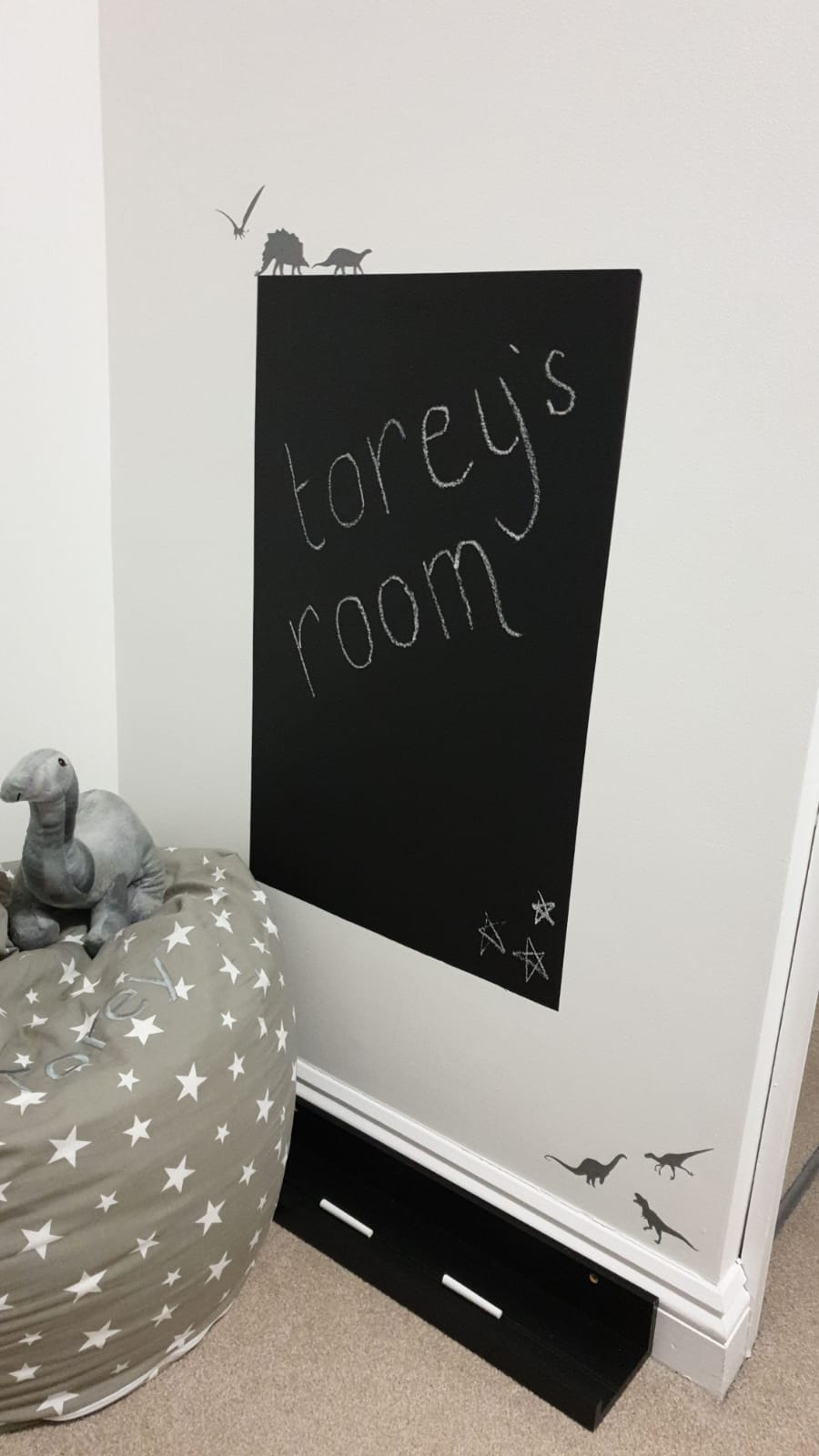 Now, I don’t know if you feel the same, but I’m really not too keen on mess and clutter, but at the same time, I love to have a creative child! So rather than researching and trying to find the best suitable free-standing chalkboard, I decided on buying a “Self-adhesive roll of chalk paper”.
