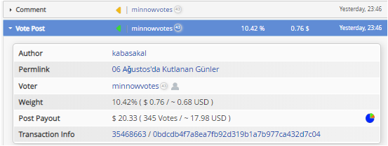 https://steemit.com/@kabasakal/06-agustos-da-kutlanan-guenler for 4 transfers. 3 of them (16.03 steem) were accepted for the next round. 1 of them (2 steem) was accepted for the current tour. 2 steem votes by you.image.png