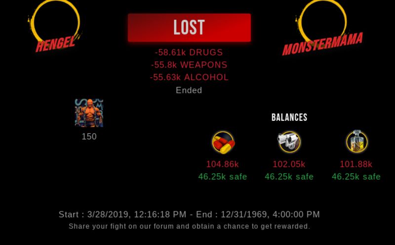 Check my latest fight ! hengel vs monstermamamonstermama (44)in #undefined • 7 years ago (edited) This was a past attack. I am posting it as a reminder. Sometimes I am weak and get attacked, and lose. But sometimes I am like I am right now. Strong strong strong. #drugwars-fight #gaming #fight #dw