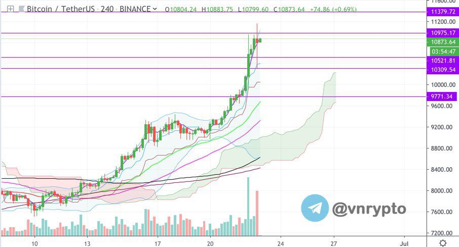 Phân tích nhanh giá BTC trong ngắn hạn: sau nửa ngày tăng giá mạnh mẽ thì BTC đã đạt mức giá cao nhất là 11160$, tại giá này thì BTC đã có 1 cây nến điều chỉnh giảm mạnh về 10310$, đúng như những gì đã chia sẻ rằng thị trường đang rất tham lam nhưng lại đang rất sợ hãi, giá khi chạm 10310$ thì đã chạm bật rất nhanh trở lại vùng 108xx, qua đó hình thành 1 mức điều chỉnh trong thời gian ngắn, theo ad nhận định thì kênh lên vẫn đang được duy trì với độ hưng phấn và sự tuyệt vọng của những cá con đã bán giá ở dưới giá 10k$, hơn nữa những các con nào đã short ở dưới giá 10k$ bây giờ đang mong chờ để cắt lỗ, chính tâm lý này nó lại càng giúp giá BTC trụ bền hơn ở giá trên 10k$