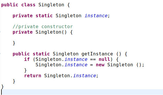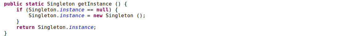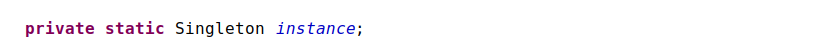 You will have noticed that this method refers to the instance attribute. Instance is a private static attribute of the singleton itself and is implemented as follows:
