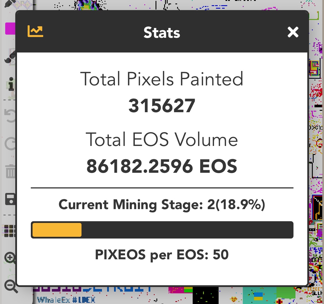 You can check out our volume, mining stage and total number of pixels painted directly in the paint game under the stats button. Also user and volume stats on dappradar: https://dappradar.com/eos/973/pixeos