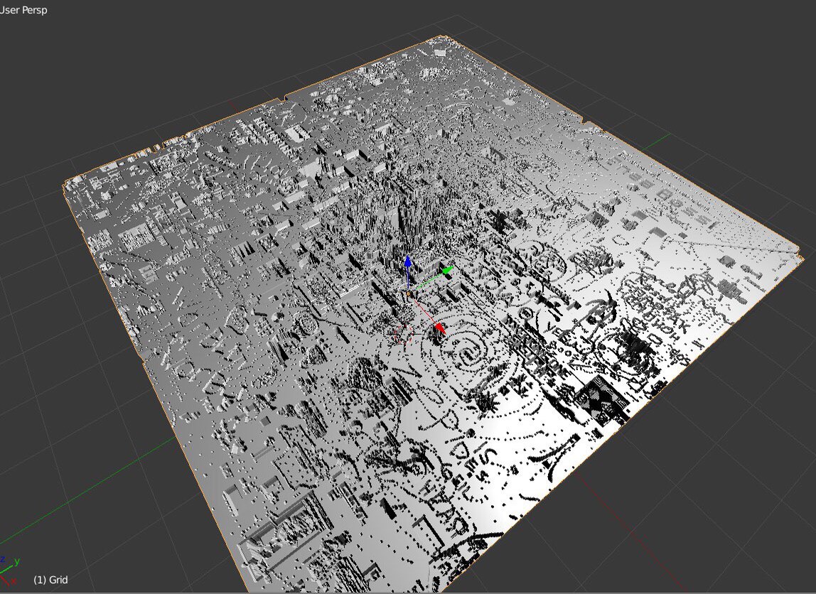 The UI/UX team has been busy making "Find Voxie" games using the 3D image of the pixEOS Paint canvas. This 3D image has been named pixEOS City. In order to understand what's going on here, the team created a three dimensional image of the heat-mapped pixEOS Paint canvas. What this means is that all painted pixels are converted into buildings, and the pixels that have been painted over the most are the tallest buildings in the 3D image.