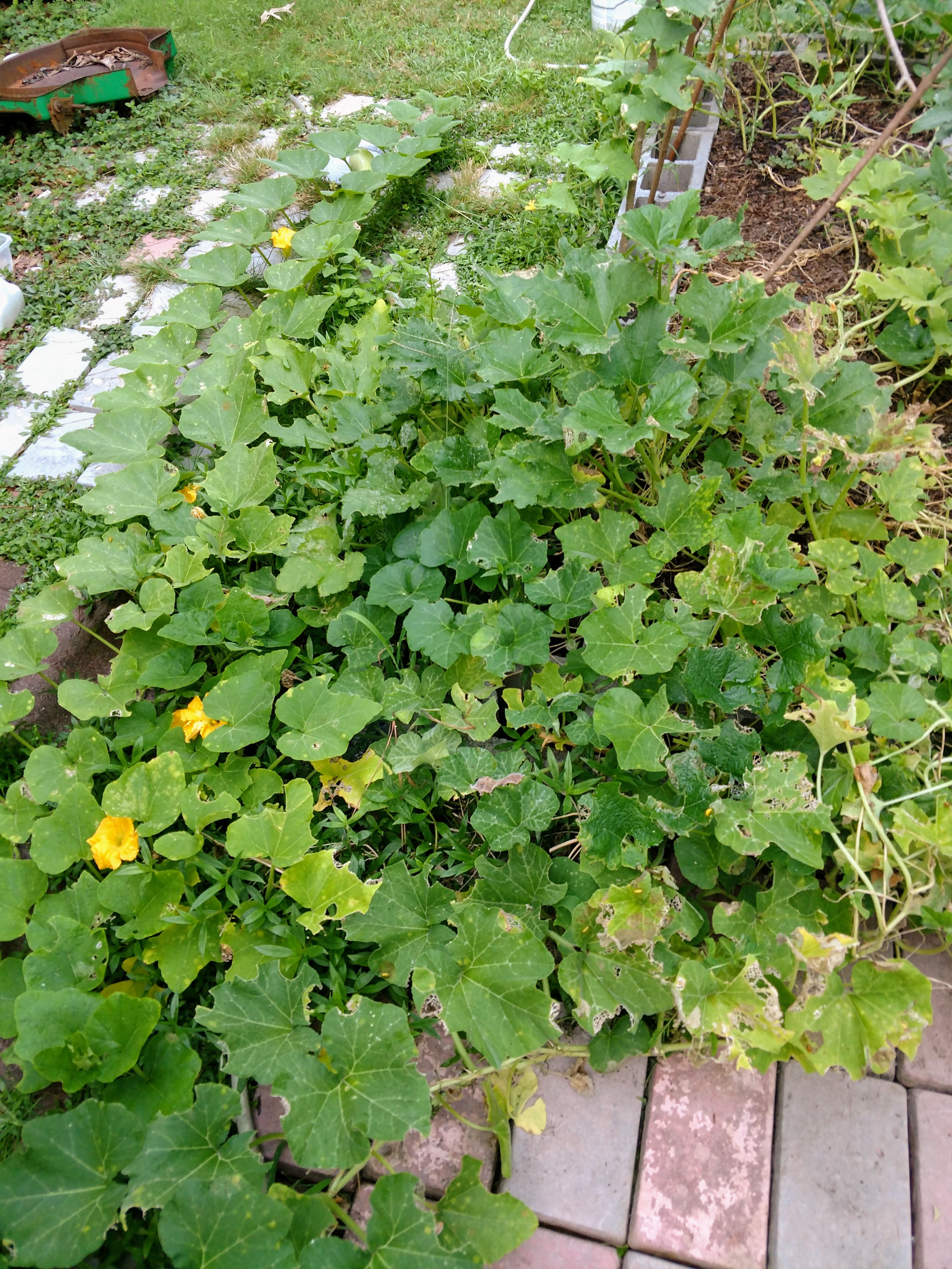 A lot of the plants started getting hit by worms and just wilted in the relentless heat, so @dksart recently started pulling up the ones that looked pretty rough to clear out some room for the next planting. Some of the squash seems to be bouncing back a bit, though. A few of the plants might have gotten a little out of control...