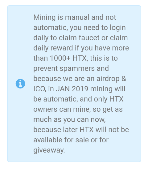 Mining is manual and not automatic, you need to login daily to claim faucet or claim daily reward if you have more than 1000+ HTX, this is to prevent spammers and because we are an airdrop & ICO, in JAN 2019 mining will be automatic, and only HTX owners can mine, so get as much as you can now, because later HTX will not be available for sale or for giveaway.