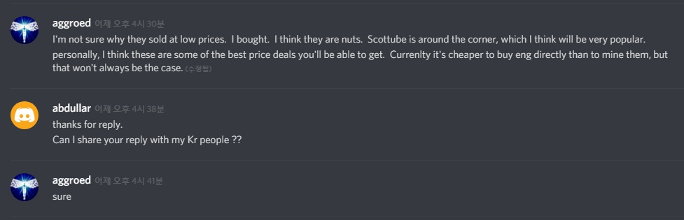 스팀엔진에서 사용료를 지급할때 사용되는 ENG토큰에 관한 @ayogom님의 글을 읽고, @aggroed에게 DM을 보냈습니다. 개인적으로 ENG를 채굴하는 EMFOUR을 구매해 스테이킹중이기도 하고, ENG의 가격이 폭락한 이유도 궁금했습니다.