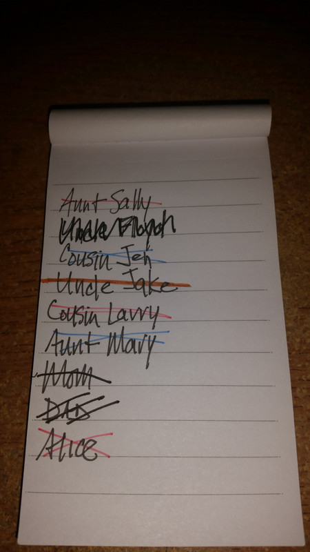 The list, my initial idea was to just find an image of some notebook paper and then use my image editor to put the text in with check marks. My wife is my editor in all things, so she read the story before I posted it. In the copy she was editing it just said "List image here" followed by the list of names. She asked what my plan was, and then said, "Well why don't you just let me do a hand written list and use that?" Loved the idea instantly, and then after she wrote down the names I gave her she said, "I an going to cross them off the list instead of check marks." Good idea. She is a school teacher who has an obsession with pens, markings, all sorts of writing implements. So as she pulled out a zippered bag filled with about 20 pens she said, "I almost want to use different pens to cross them out." Again, loved the idea, and I said, "That is perfect. It adds a whole other level of psychoticness." I know it is a small part of the whole thing, but I knew that I wanted the list once I had the idea of her killing off her family, and I love how her small ideas added to the overall story.