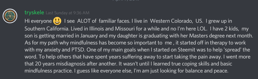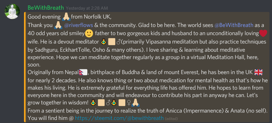 And then, last week, I came across @bewithbreath, who wanted to form a list of meditators on Steemit. What if, I thought, we ran a group under the Natural Medicine banner, getting the benefits of a Natural Medicine upvote? @bewithbreath was keen to start a 'Meditation Hall' where we could run sessions for Steemians, and @tryskele, who started the #mindfulmonday tag, would do the curations. Read their introduction bios below - I'm thrilled to have them on the team! @porters, a vipassana meditator and a long time Natural Medicine contributor, will also be part of this too, helping moderate the channel and getting involved in the sweetness ways that only @porters can.