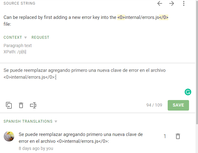 SPANISH: <0> Nota </0>: Cambiar un error existente para usar el módulo <1> internal/ errors </1> debe