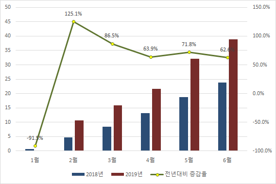 2019년 6월까지 누적으로는 $38.85가 입금되어 전년 동월 누적($23.90) 대비 62.6% 증가하였습니다.