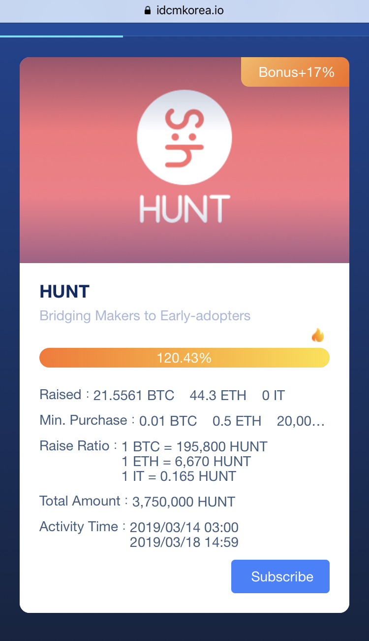 As we mentioned, we are planning to run some more IEOs, but IDCM’s average bonus rate is the highest. If you’re interested in purchasing HUNT token please check out the 17% bonus deal.