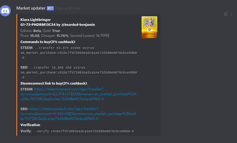 You can join my discord server where you can get cheap card notification of steemmonsters card. You can send the amount to this account to get 3% discount. This is valid for all other cards as well, just send required amount to svirus with valid memo. Don't worry, you will get refund in case you do mistake or card is not available