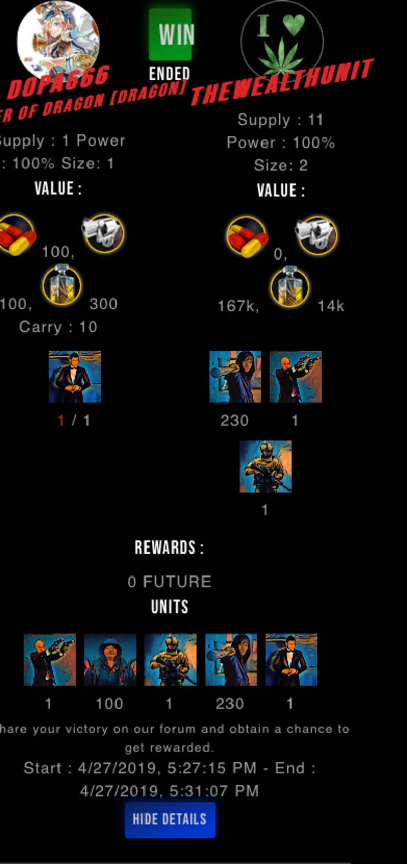 Congratulations @thewealthunit ! Your fight received an upvote of 1% from the King Dealer as incentive for your activity and as a gratitude for your support to the game.