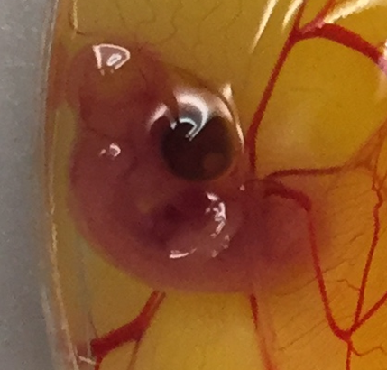 This is a 5 day old chick embryo taken by one of my students. The black circle is it’s eye. Right below it is the heart. The heart beats about twice a minute and the embryo itself moves around quite a bit (mostly twitching at this stage). The blood vessels extend throughout the yolk. I highly recommend you check out this video to see it’s full development.