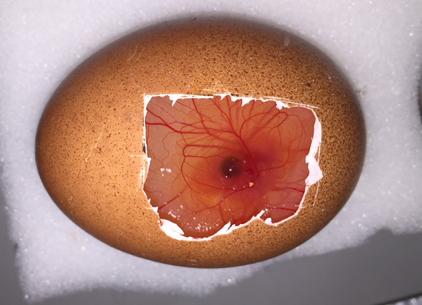 A properly windowed egg. The embryo is a bit obscured by yolk, but you can clearly see the black eye.