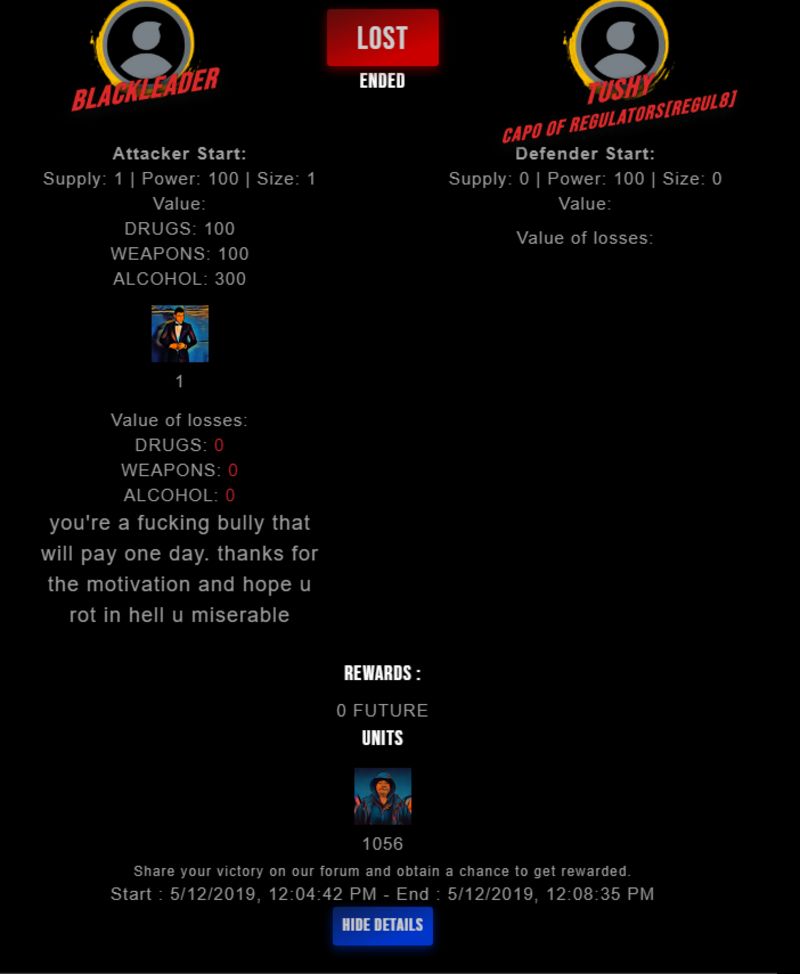 Check my latest fight ! blackleader vs tushytushy (57)in #undefined • 7 years ago #drugwars-fight #gaming #fight #dw