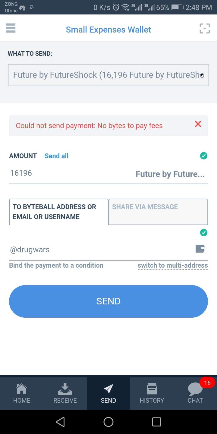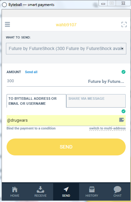 Write Down The Amount You Want To Send And Send it to @drugwars Their Obyte Username e.g