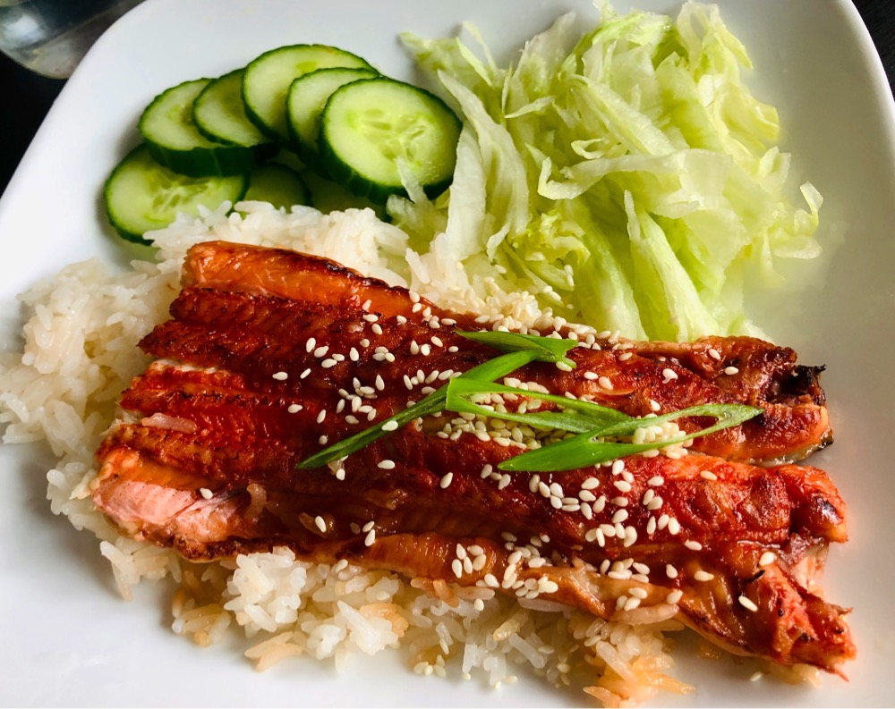 I feel like eating something light when it’s hot outside. So I made this simple dish when I put the fish on the steamer cooked with rice. Add some lettuce and cucumbers and here is my dinner.
