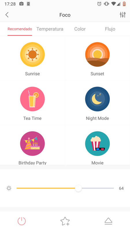 La verdad es que tiene mas opciones de las que esperaba. Se le puede cambiar el color, en caso de ser blanco, también la temperatura, es posible ajustar el brillo, además es posible ejecutar ciertos scripts que permiten que el color vaya variando de forma automáticas. Por ejemplo Sunrise va aumentando la intensidad luminosa poco a poco, al contrario de Sunset.