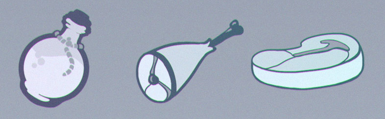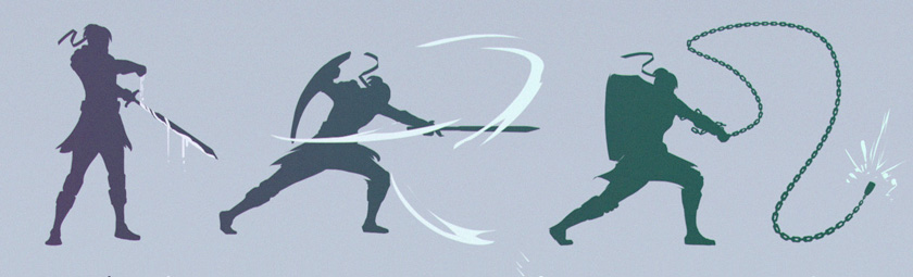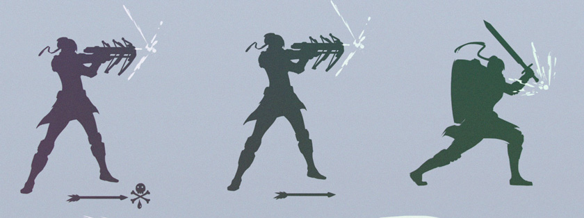 Left is 'poison crossbow adds poison to the minor damage it deals, center is normal crossbow and left is 'pommel bash' which deals minor damage and stuns enemies, cannot do anything their next turn.