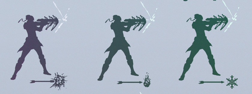 Crossbow - deals minor damage to a single enemy. Left is 'explosive' deals extra damage, center adds fire damage and right adds ice damage, though this last one was not used I think.