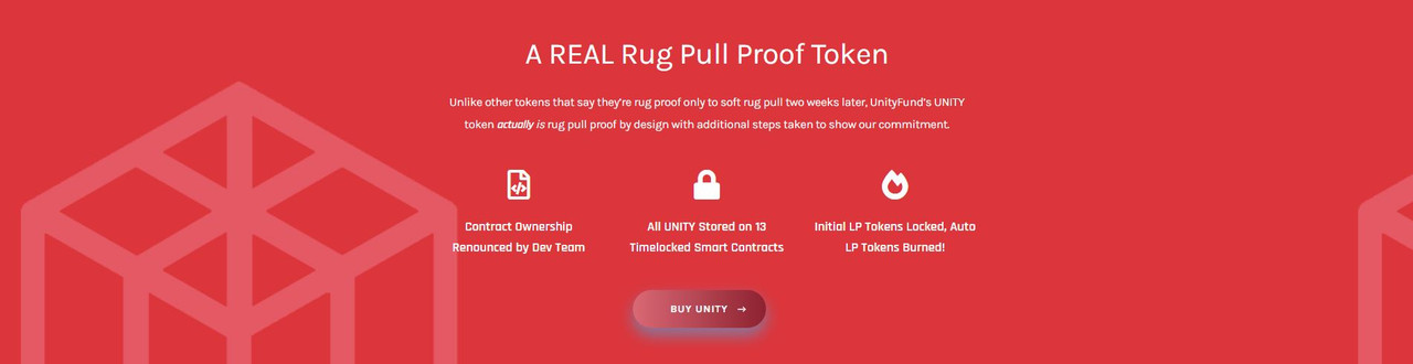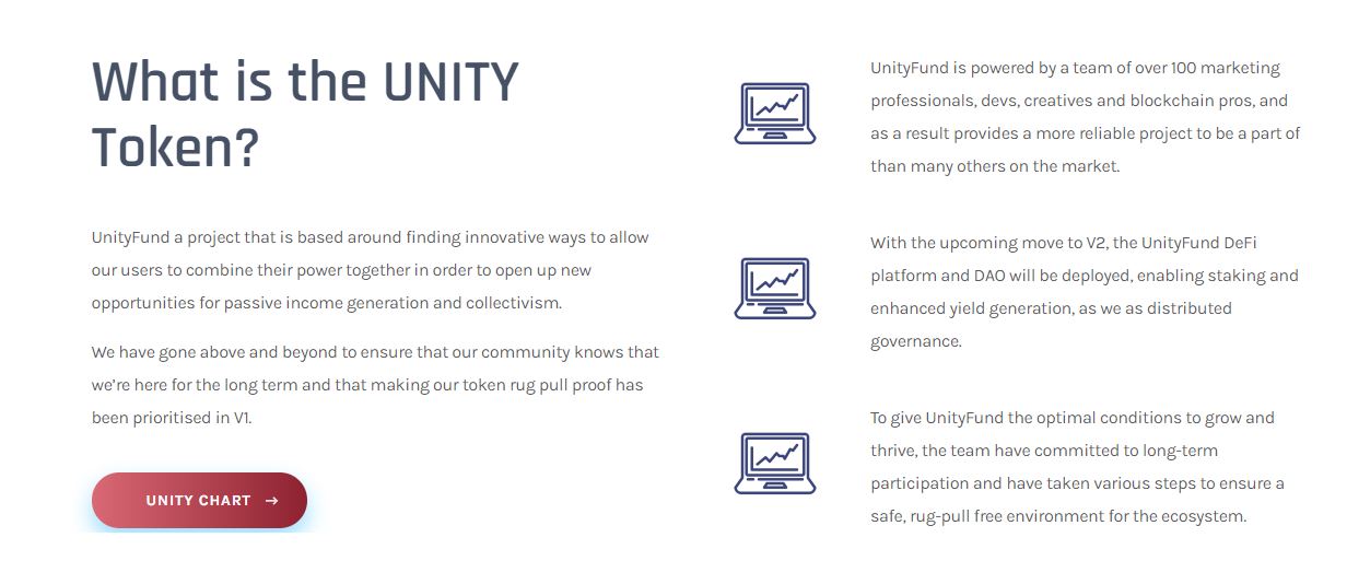 UnityFund is a cutting-edge crypto project based on finding exceptional innovative ways to enable our users to synergize their strengths together to open up new opportunities for passive income generation and collectivism. We have gone so far as to ensure that our community knows we are here for the long term and that creating our token carpet pull-proof has been a priority in V1. UnityFund is backed by a team of over 100 marketing professionals, developers, creatives, and blockchain pros, and as a result, provides more reliable projects to be a part of than many other projects on the market. With the upcoming move to V2, UnityFund DeFi and DAO platforms will be deployed, enabling staking and yield enhancement, just like us as distributed governance. To provide UnityFund with optimal conditions for growth and development, the team has committed to long-term participation and has taken various steps to ensure a safe and drug-free environment for the ecosystem.