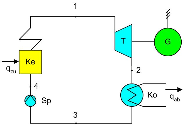 A Rankine Cycle consists of a cyclic series of thermodynamic transformations carried out by a plant, which can be realized with different fluids, for simplicity of understanding we can imagine that this plant works by making simple water flow inside it. It consists of the series connection of the following components: a pump, a boiler, a turbine and a condenser. The process we want to analyze is representative of a real plant, so I will not dwell on the ideal aspect of the transformations in play, so we will assume the always real transformations. A scheme like the one below could make the idea of a plant we want to analyze.