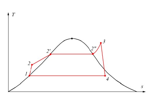 The fluid is taken from the condenser and passed into the pump, during this first phase the fluid is subjected to a transformation of adiabatic compression, at the end of this first transformation the water is brought to a pressure equal to that present in the boiler vaporiser, in this component therefore the water undergoes heating at constant pressure until it reaches the saturation temperature (at this point the fluid is in the state of saturated liquid) . The fluid is evaporated evolving in the state of saturated steam to then be sent to the turbine. In the Turbine the fluid is made expand adiabatically so as to produce Mechanical Work (just at this point of the process cogeneration can occur transforming mechanical energy into electrical energy or exploiting the residual heat of the evaporation of the fluid in the condenser), once expanded the fluid is again sent to the condenser where it will return to the state of saturated liquid to then repeat the cycle.