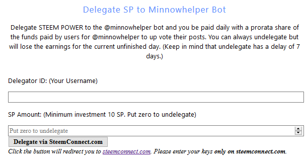 Form for Investors to delegate SP to Minnowhelper Bot. (http://www.minnowhelper.com/delegate.html)