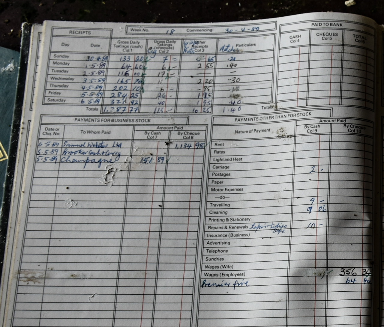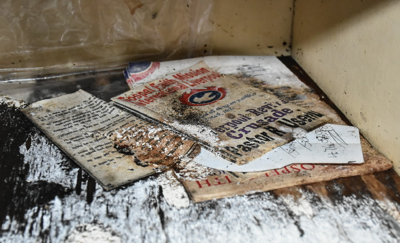 Detritus, an accounts ledger from 1989, religious text fliers and a mug