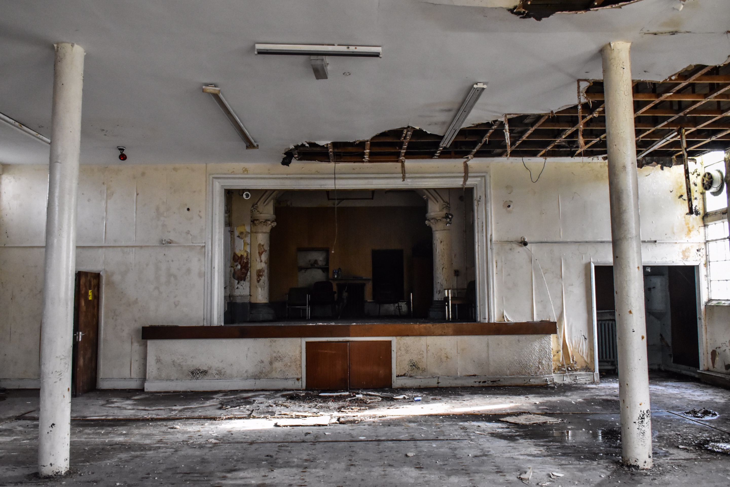 This one was so easy to get into thanks to some squatters who had set up a camp in a room at the back of one of the halls, I moved the boards away and was in there a good hour, didn't bump into them. When I came to leave the boards had been replaced!! That was fun.